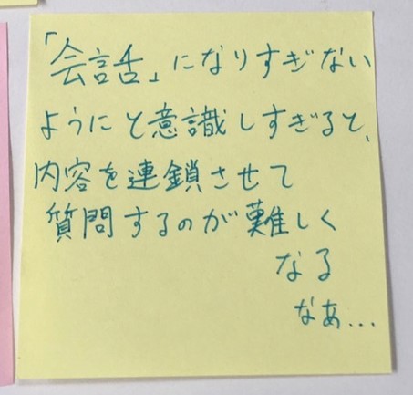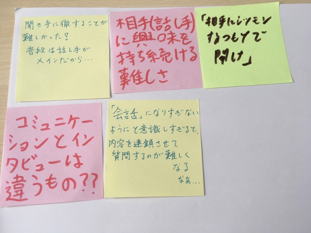 第一に、とてもおもしろかったです。インタビューそのものもそうですが、それを経た上での振り返り、そこから更に問いや疑問が広がっていくという一連のプロセスが非常に興味深いものでした。人の発した言葉を自分なりにかみくだいて解釈するというのは、人と関わっていく上で重要なスキルだなと感じたと同時に、相手の言葉そのまんまそのものを尊重して大事にするということも必要だということを、「言葉に権利はあるか?」の問いで気づかされました。この相反する2つのバランスを上手く保つことこそが、インタビューゲームのだいごみだと、思います。(Sさん)